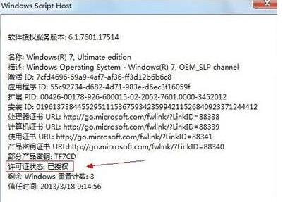 7、再到运行框中输入slmgr.vbs -dli,查看是否也是“已授权”状态,如果这两步操作后均显示“已授权”则表示系统激活成功