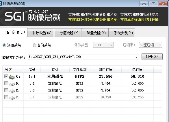 3、在打开的软件界面中选择【还原系统】,然后在映像文件路径选择win7.gho文件,勾选C盘,最后点击【执行】,进入下一步。