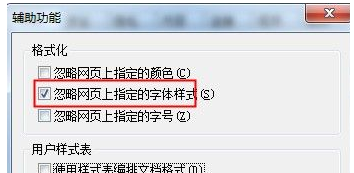 3、勾选“忽略网页上制定的字体样式”,点击确定;
