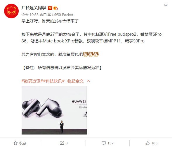 该博主称,本月 27 号华为将发布 Free buds Pro 2 耳机、智慧屏 S Pro 86、Mate book X Pro 新款、旗舰平板 MatePad Pro 11 和华为畅享 50 Pro 众多新品。