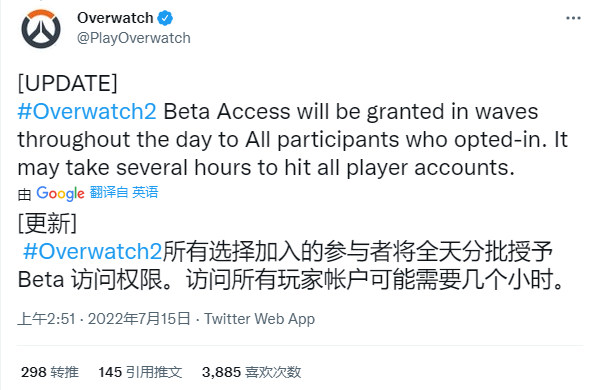 小编 7 月 15 日消息,守望先锋官方现表示:《守望先锋》“归来”Beta 测试将会向所有提交申请的玩家开放,授权可能需要几个小时才能到达所有玩家的账户。