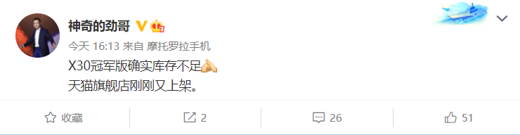 小编 7 月 15 日消息,今天,联想集团中国区手机业务部总经理陈劲表示,moto edge X30 冠军版确实库存不足,而摩托罗拉天猫官方旗舰店刚刚上架。目前摩托罗拉京东自营旗舰店显示,moto edge X30 冠军版也处于缺货状态。
