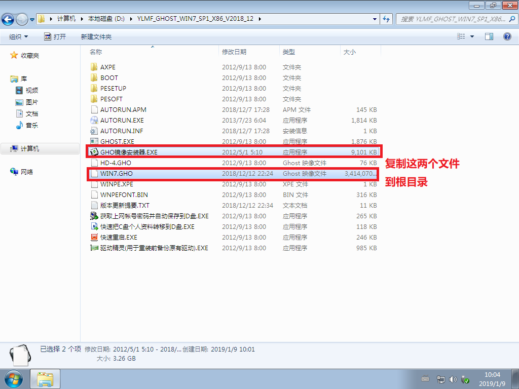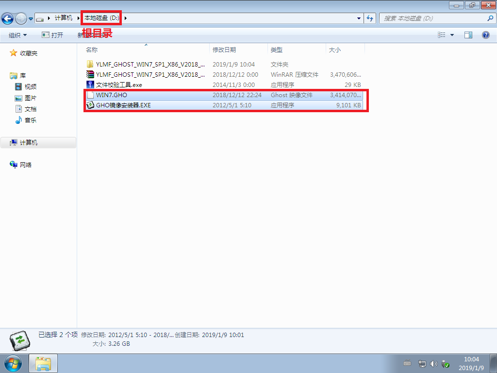 1.下载好系统后,把【WIN7.GHO】和【GHO镜像安装器(安装系统或硬盘安装)】两个文件剪切到磁盘根目录下,这里选择放在D盘里;