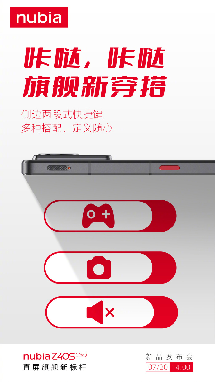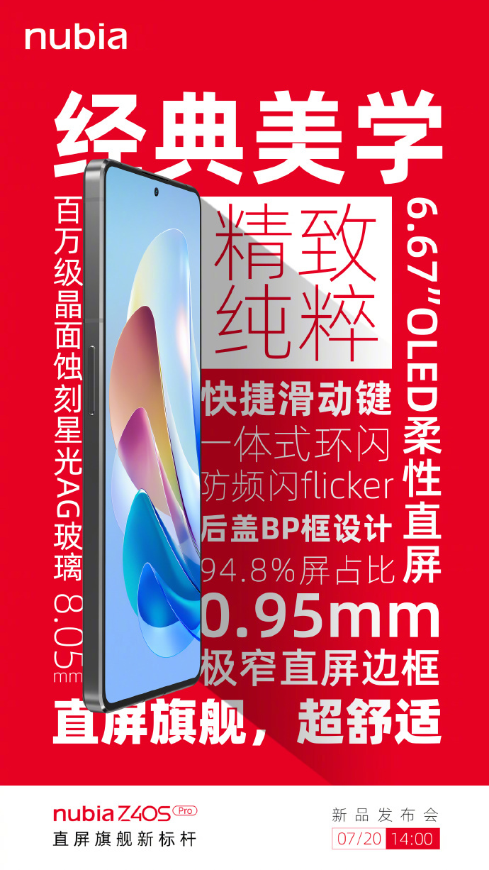 小编了解到,努比亚 Z40S Pro 新品发布会将于 7 月 20 日 14:00 召开。届时,努比亚 Z40S Pro 直屏旗舰将正式亮相。