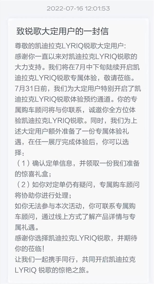 尊敬的凯迪拉克 LYRIQ 锐歌大定用户:感谢你一直以来对凯迪拉克 LYRIQ 锐歌的大力支持。我们将在 7 月中下旬陆续开启凯迪拉克 LYRIQ 锐歌专属体验,敬请莅临。7 月 31 日前,我们为大定用户特别开启了凯迪拉克 LYRIQ 锐歌体验预约通道。你的专属购车顾问将与你联系,诚邀你全方位体验凯迪拉克 LYRIQ 锐歌。同时,我们为上述大定用户额外准备了一份专属体验礼遇,在任一展厅完成体验后,你可以选择:(1) 确认定单信息,并领取一份我们准备的惊喜礼盒;(2) 如你对定单仍有疑问,专属购车顾问将协助你进行处理; 如你无法参与本次活动,你可联系专属购车顾问,通过线上方式了解产品详情与专属礼遇。