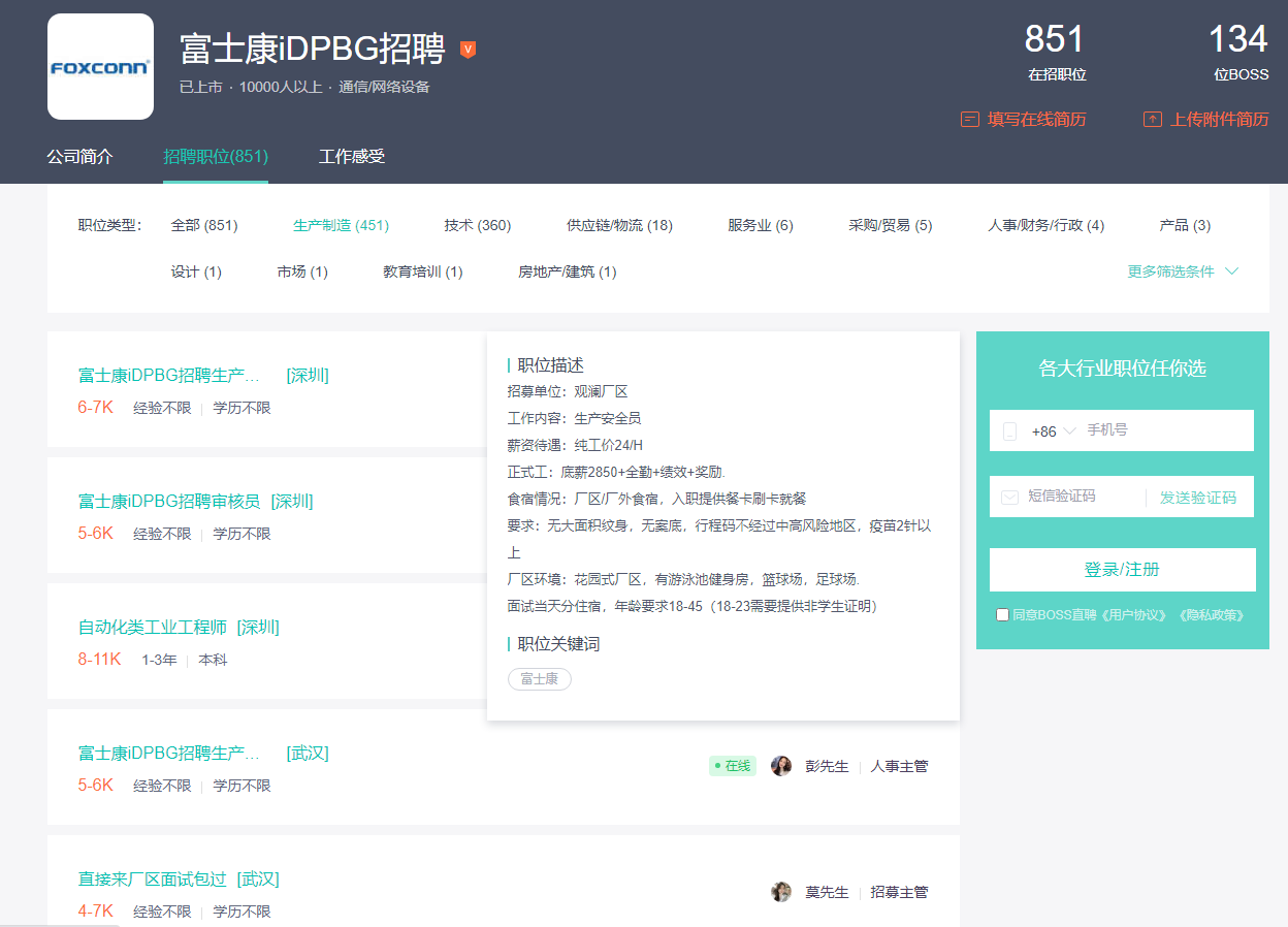 从各大招聘平台也可以看到,富士康 iDPBG 一直在大量招募生产方面的员工。