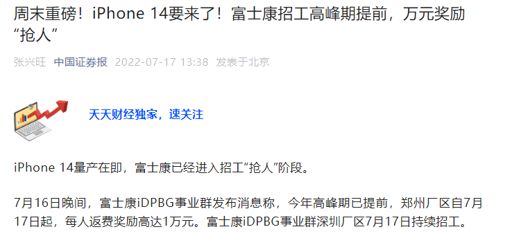 据中国证券报,富士康 iDPBG 事业群深圳厂区 7 月 17 日持续招募新员工。有深圳招聘中介人士透露,为满足 iPhone14 的组装工作,深圳观澜富士康开始招工。富士康方面则回应称“不评论客户及产品相关信息”。