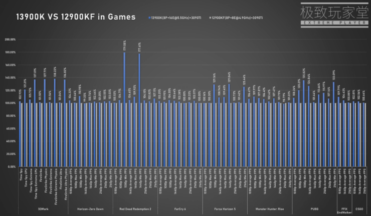 英特尔酷睿 i9-13900K 游戏性能曝光:比 i9-12900K 平均快 5%、最大 80%,但功耗也更高