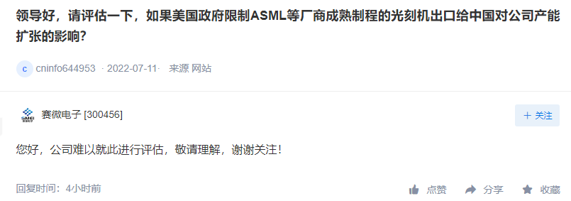 小编 7 月 18 日消息,由于外媒的一些报道,国内投资者对于国内企业采购 ASML 光刻机的事情比较关注。今日,赛微电子在互动平台上称,公司所需光刻机的持有及采购均处于正常状态。