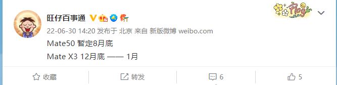 此外,数码博主 @旺仔百事通 也表示华为 Mate 50 系列将于 8 月底到来,Mate X3 将于 12 月底或明年 1 月到来。当然,Mate 50 系列已经是老生常谈了,此处就不再赘述。