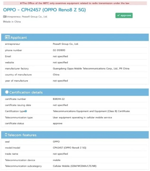 小编了解到,OPPO 这款型号为 CPH2457 手机刚刚通过 NCC 认证,而且这个型号已经在泰国 NTBC 出现过,确认对应名称为 Reno 8Z。