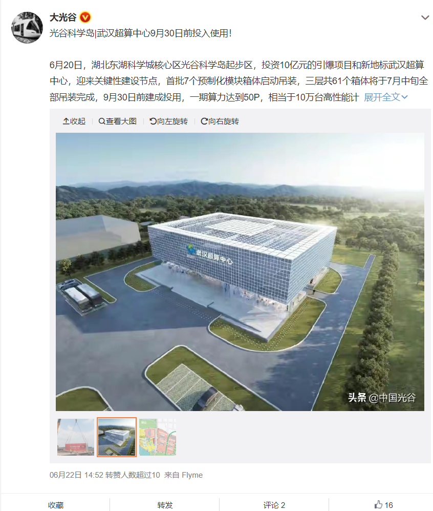 总投资 10 亿元的武汉超算中心项目封顶:计划 9 月底建成运营,首期算力相当于 10 万台高性能计算机
