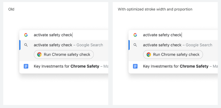 此外,今年的新图标修改了中间蓝色圆形的比例,设计师询问了与视力不佳的谷歌员工,发现新图标中蓝色与白色部分更易于识别。设计师还为小尺寸 UI 制作了不同版本的图标,以通过对齐像素边界来提高易读性并避免模糊。