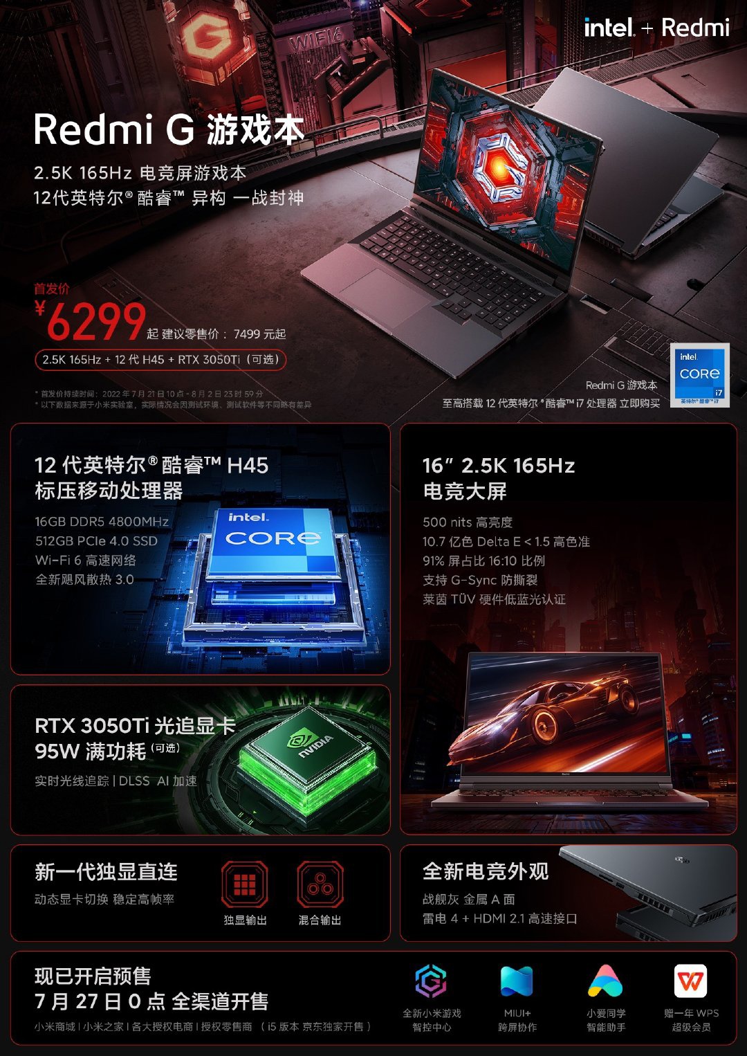 Redmi G 2022 游戏本开启预售:12 代酷睿 + 2.5K 165Hz 电竞屏,首发价 6299 元起