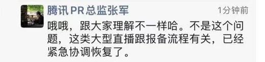 对此,腾讯公关总监张军在朋友圈回应说,这是跟大型直播报备流程有关,已经紧急协调恢复了。