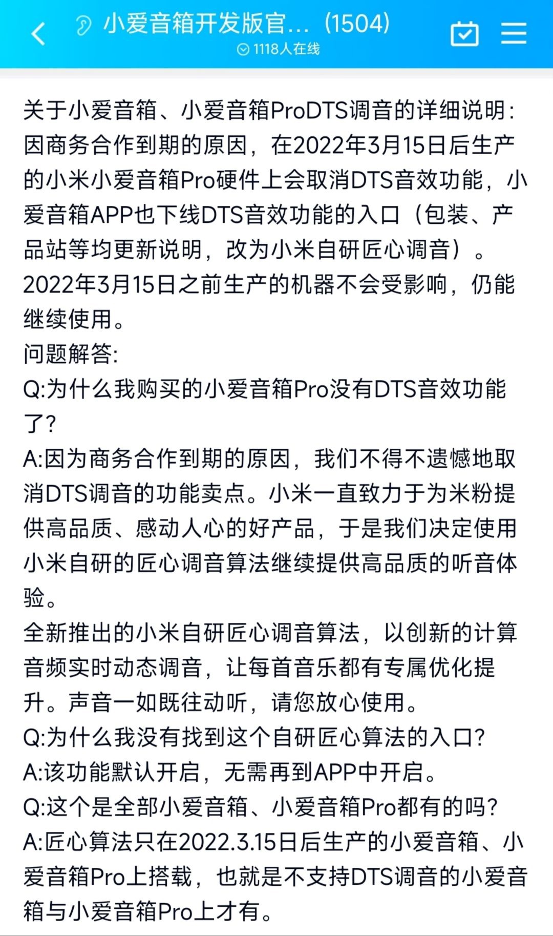 小编 7 月 21 日消息,据网友反馈,近期小米小爱音箱方面发布了关于小爱音箱、 小爱音箱 Pro DTS 调音的详细说明,其表示,“因商务合作到期的原因,在 2022 年 3 月 15 日后生产 的小米小爱音箱 Pro 硬件上会取消 DTS 音效功能 ,小爱音箱 App 也下线 DTS 音效功能的入口 (包装、产 品站等均更新说明,改为小米自研匠心调音)。2022 年 3 月 15 日之前生产的机器不会受影响,仍能继续使用。”