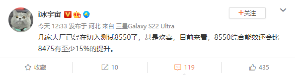 小编了解到,高通骁龙 8 Gen 2 是骁龙 8 Gen 1 的继任者,将由台积电代工,但可能依然采用 4nm 制程。数码博主 @i 冰宇宙 称,几家大厂已经开始测试骁龙 8 Gen2(SM8550),对测试效果都十分满意。相比骁龙 8 Gen1+(SM8475),全新旗舰处理器骁龙 8 Gen2 的综合能效将会有至少 15% 的提升。