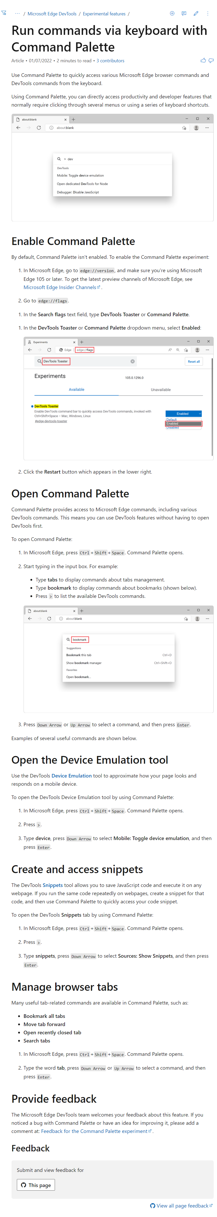 微软有还发布了 Command Palette 命令面板的支持文档,详细说明了使用键盘的用法,包括打开设备仿真工具、创建和访问代码片段以及管理浏览器选项卡。