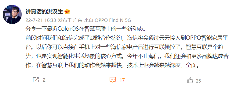 根据 OPPO 负责软件技术规划与架设的工程师洪汉生(没错,之前在魅族的那个)透露,OPPO 前段时间和海信完成了战略合作签约,海信将会通过云接入到 OPPO 智能家居平台,以后用户可以直接在手机上对一些海信家电产品进行互联操控了。