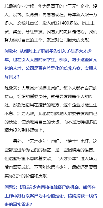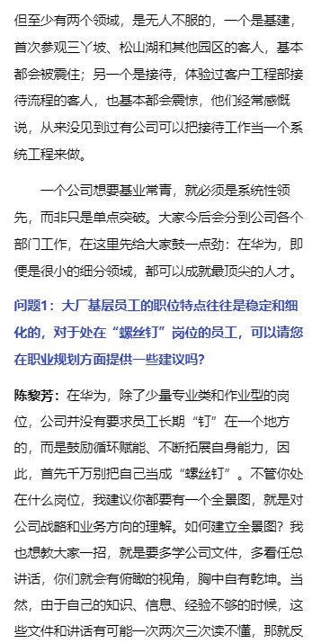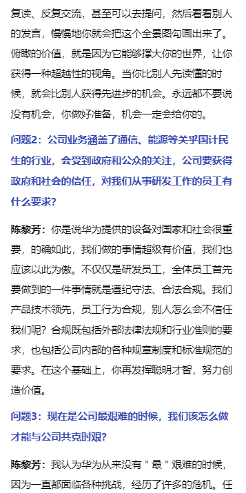 以下为《华为常务监事陈黎芳与新员工座谈:世界级难题成就世界级人才 》全文: