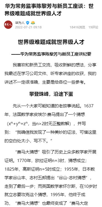 小编 7 月 21 日消息,华为心声社区今日发布《华为常务监事陈黎芳与新员工座谈:世界级难题成就世界级人才 》。