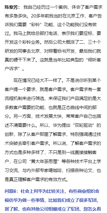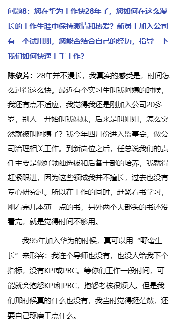 陈黎芳表示:前些年,网上有关于华为 34 岁以上员工的一些传言,都是不准确的。我早就过了 35 了,但我还是很努力的,也是很享受的,因为忙碌,觉得每天过得也特别快。所以我不觉得年龄是个问题,关键还是自己的能力,能不能始终坚持学习和提升。