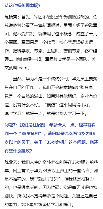 华为常务监事陈黎芳在与新员工座谈中提到了“35 岁危机”问题,有员工提问称“请问您是怎么看待华为 35 岁以上的员工,关于“35 岁危机”这个问题,您还有些什么建议?”