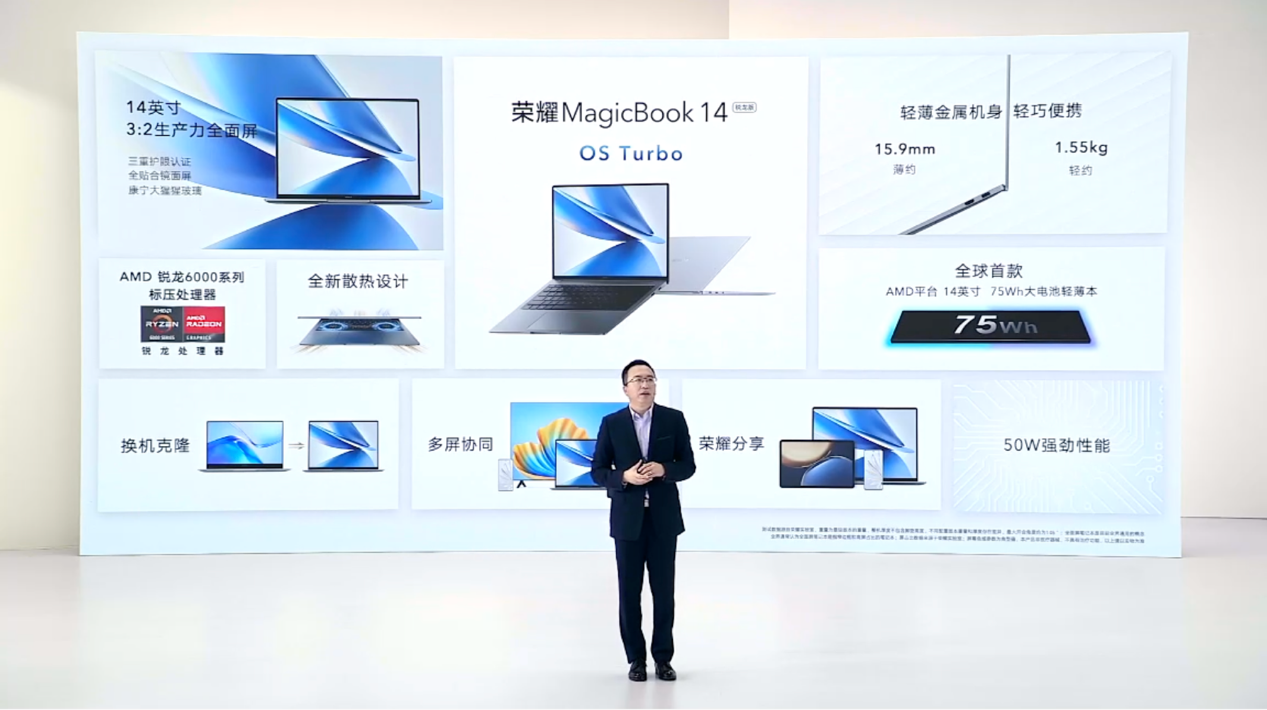 荣耀于 7 月 21 日晚举行新品发布会,发布旗下电脑新品荣耀 MagicBook 14 锐龙版,以及荣耀平板 8、荣耀智慧屏 X3 系列等新品。荣耀 MagicBook 14 锐龙版也是荣耀首款支持自家 OS Turbo 技术的 AMD 平台电脑。在发布会后,荣耀 CEO 赵明接受了包括凤凰网科技在内的媒体采访。
