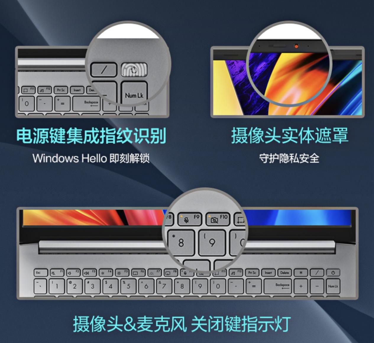 B 面的摄像头配备了实体遮罩,通过键盘上的屏蔽按键一键守护隐私,C 面电源键集成指纹识别功能,配合 Window Hello 功能体验秒解锁的顺畅感。