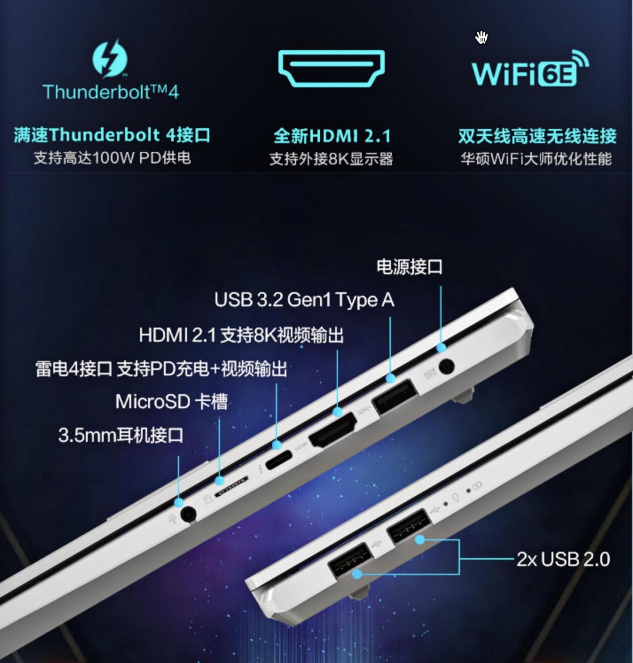 满速全功能雷电 4 协议 Type-C 接口,支持 100W PD 快充,满血 HDMI2.1 接口,WiFi 6E + 蓝牙 5.2 全都给你安排上,接口数量和协议标准都妥妥够用。