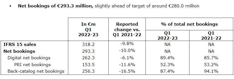 财务数据方面,本季度育碧的整体收入同比有所下降,季度销售额为 3.182 亿欧元(约 21.96 亿元人民币),比去年同期的 3.53 亿欧元下降了 9.8%;净预订额为 2.933 亿欧元,略高于公司预测,但比去年同期的 3.26 亿欧元下降了 10%。