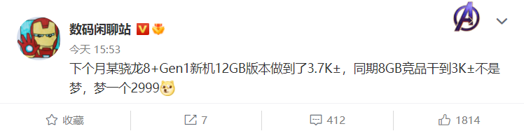 8 月份还将有一些骁龙 8+ Gen 1 新手机到来,据微博博主 @数码闲聊站 称,“在 8 月份,某骁龙 8+ Gen 1 新机 12GB 内存版做到 3700 元左右,同期 8GB 内存竞品可做到 3000 元左右,有可能达到 2999 元。”该博主补充表示,存储版本分别是 12GB+256GB、8GB+128GB。