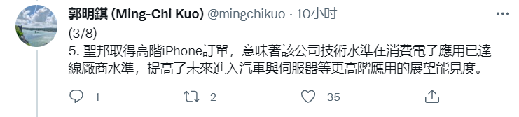 此外郭明錤称,受益于成本优势与苹果降低供应风险的供应链政策,圣邦微电子在苹果供应链的市占率将持续增长。此外,该公司技术水准在消费电子应用已达一线厂商水准,提高了未来进入汽车与服务器等更高阶应用的展望能见度。