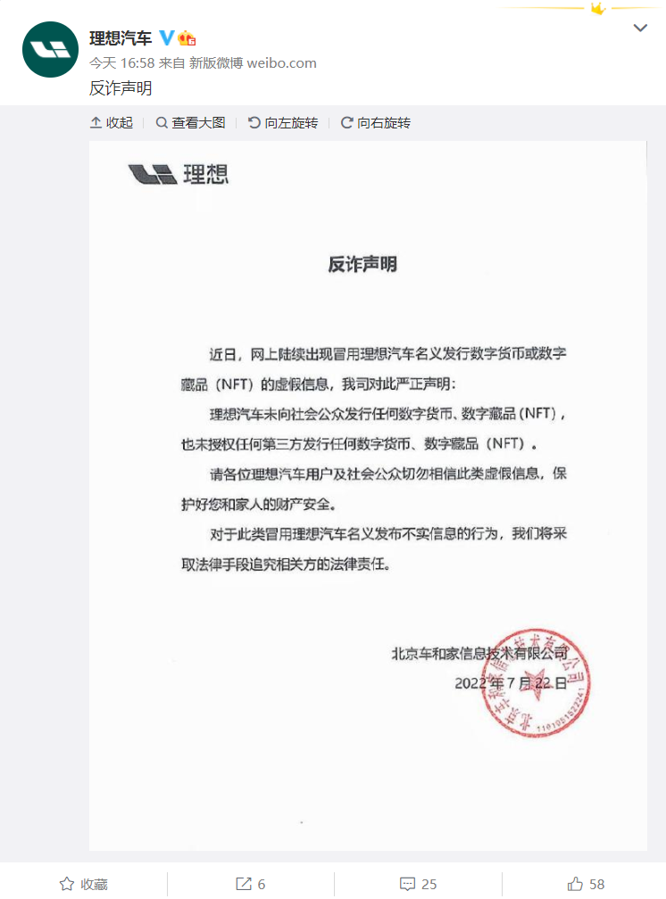 反诈声明近日,网上陆续出现冒用理想汽车名义发行数字货币或数字藏品(NFT)的虚假信息,我司对此严正声明:理想汽车未向社会公众发行任何数字货币、数字藏品(NFT),也未授权任何第三方发行任何数字货币、数字藏品(NFT)。请各位理想汽车用户及社会公众切勿相信此类虚假信息,保护好您和家人的财产安全。对于此类冒用理想汽车名义发布不实信息的行为,我们将采取法律手段追究相关方的法律责任。北京车和家信息技术有限公司司2022 年 7 月 22 日