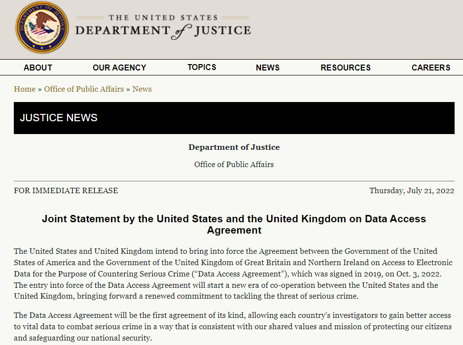 小编 7 月 23 日消息,美国司法部(DoJ)和英国内政部在近日的联合新闻稿中宣布,美国和英国已经签署了一项数据访问协议,该协议将允许每个国家的执法机构向对方索取用户互联网数据。