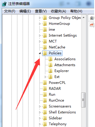 2、进入注册表界面,依次定位到【HKEY_CURRENT_USERSoftwareMicrosoftWindowsCurrentVersionPolicies】项下