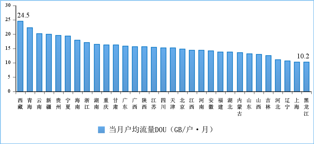 中部地区移动互联网接入流量增速领先,西部部分省份 DOU 值屡创新高。上半年,东、中、西部和东北地区移动互联网接入流量分别达到 528 亿 GB、281 亿 GB、368 亿 GB 和 64 亿 GB,同比增长 20.5%、21.8%、20% 和 13.2%。西藏、青海、云南和新疆 4 省 6 月当月户均移动互联网接入流量 (DOU) 超过 20GB / 户・月;6 月分省 DOU 最高值比 5 月份高出 0.7GB / 户・月,最高值与最低值之差为 14.3GB / 户・月。