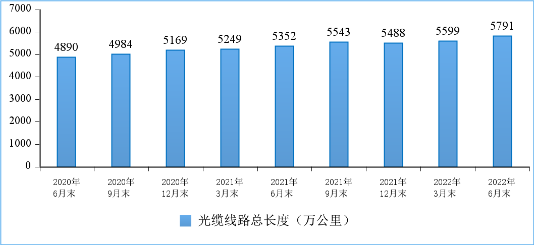 光缆线路总长度稳步增加。截至 6 月末,全国光缆线路总长度达到 5791 万公里,同比增长 8.2%,比上年末净增 303 万公里。其中接入网光缆、本地网中继光缆和长途光缆线路所占比重分别为 62.6%、35.5% 和 1.9%。