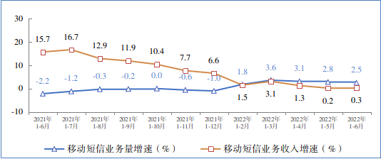 移动电话通话量小幅增长,移动短信业务收入低速增长。上半年,移动电话去话通话时长完成 1.12 万亿分钟,同比增长 1%;固定电话主叫通话时长完成 410 亿分钟,同比下降 12.2%。上半年,全国移动短信业务量同比增长 2.5%,移动短信业务收入同比增长 0.3%,增速较一季度分别回落 1.1 和 2.8 个百分点。