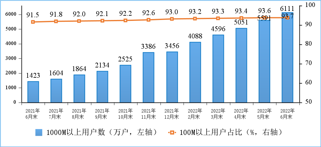 固定宽带接入用户数稳步增加,千兆用户占比超一成。截至 6 月末,三家基础电信企业的固定互联网宽带接入用户总数达 5.63 亿户,比上年末净增 2705 万户。其中,100Mbps 及以上接入速率的固定互联网宽带接入用户达 5.27 亿户,占总用户数的 93.7%,占比较上年末提升 0.6 个百分点;1000Mbps 及以上接入速率的固定互联网宽带接入用户达 6111 万户,比上年末净增 2656 万户,占总用户数的 10.9%。