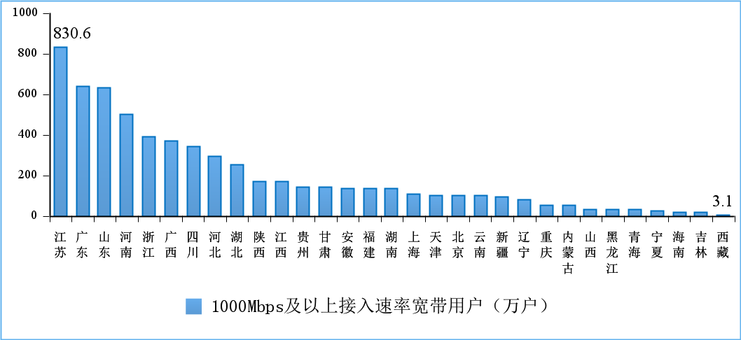图 11 2022 年 6 月份 1000Mbps 及以上接入速率的宽带接入用户各省情况