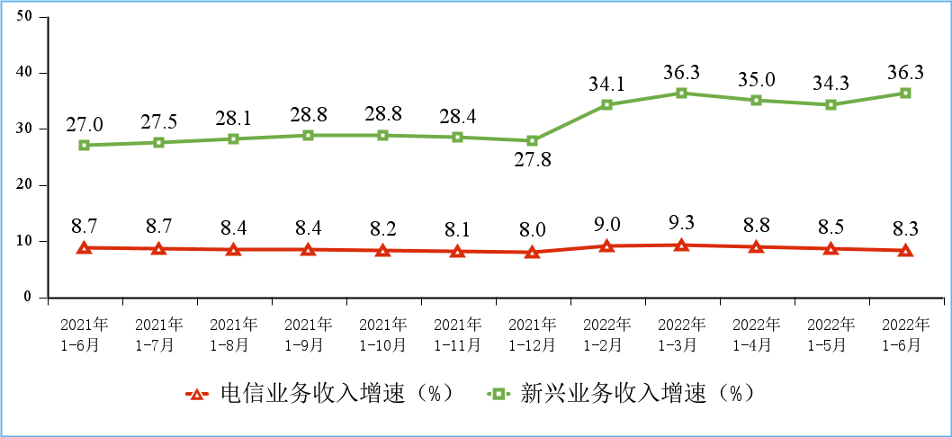 电信业务收入平稳增长,电信业务总量保持两位数增幅。上半年,电信业务收入累计完成 8158 亿元,同比增长 8.3%。按照上年不变价计算的电信业务总量同比增长 22.7%。