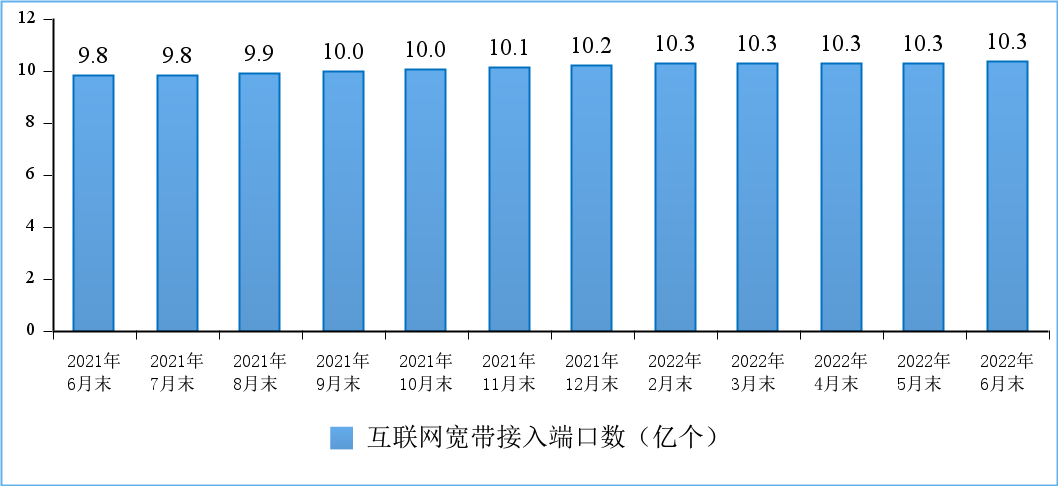 千兆光纤宽带网络覆盖和服务能力提升。截至 6 月末,全国互联网宽带接入端口数量达 10.3 亿个,比上年末净增 1685 万个;其中,光纤接入(FTTH / O)端口达到 9.85 亿个,比上年末净增 2517 万个, 占比由上年末的 94.3% 提升到 95.2%。截至 6 月末,具备千兆网络服务能力的 10G PON 端口数达 1103 万个,比上年末净增 318 万个。