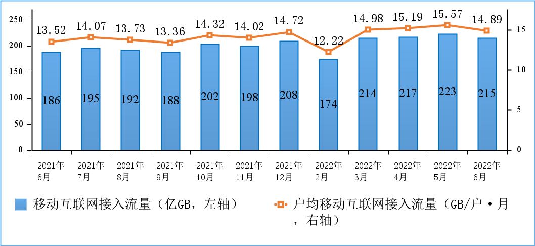 移动互联网流量快速增长。上半年,移动互联网累计流量达 1241 亿 GB,同比增长 20.2%。截至 6 月末,移动互联网用户数达 14.5 亿户,比上年末净增 3065 万户。6 月当月户均移动互联网接入流量 (DOU) 达到 14.89GB / 户・月,同比增长 10.1%,比上年底高出 0.17GB / 户・月。