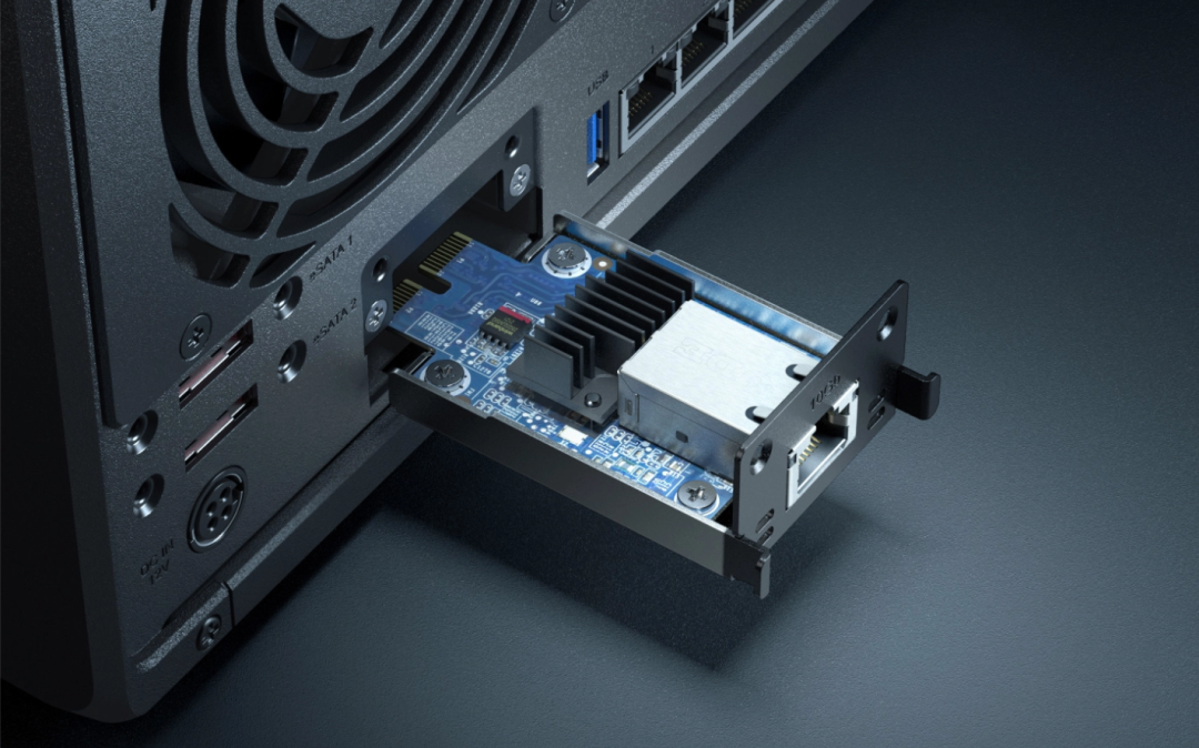 小编了解到,DS1522+ 搭载了 AMD 双核处理器,主频 2.6GHz,最高 3.1GHz,配备 8GB DDR4 ECC 内存,可扩展至 32GB,配备 M.2 硬盘插槽,接口包括两个 USB 3.2,四个 1G 网口和两个 eSATA 接口。除此之外,在 DS1522+ 后方有一块比较特别的接口,安装 E10G22-T1-Mini 网络附加卡,即可支持拓展万兆。