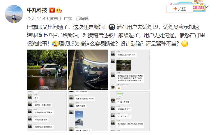 理想 L9 虽然 8 月份才正式交付给用户,但目前已经开启试驾活动,这意味着该车正式开始接受消费者的检验。但今日有博主称,理想 L9 又出问题了,并且这次还是断轴。