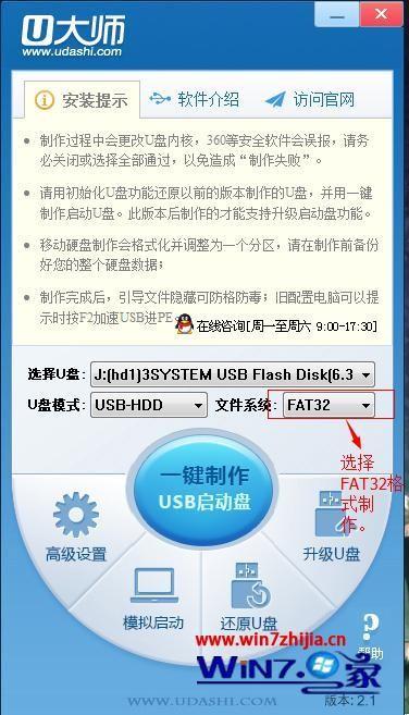 3、接着在U大师窗口中,文件系统中选择FAT32格式制作,然后点击一键制作就可以了。