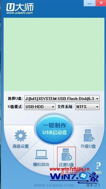 1、首先打开U大师窗口,然后点击“还原U盘”项。