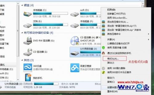 2、接着双击桌面上的“计算机”图标,然后鼠标右击U盘盘符,选择“格式化”选项;