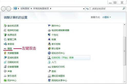 2、在控制面板中我们找到键盘,并左键双击:键盘;如图所示: